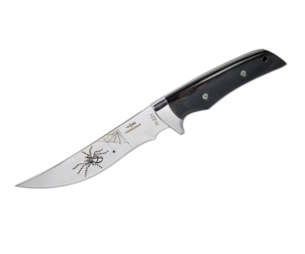 Нож нескладной разделочный H-221 Spider – это удобный для использования в полевых условиях и в быту клинок с накладной рукояткой и оригинальным оформлением лезвия. Основной материал изготовления – сталь 65Х13, закалка клинка произведена до 55-56 HRC. Качественная сталь гарантирует ножу прочность и стойкость перед коррозией.