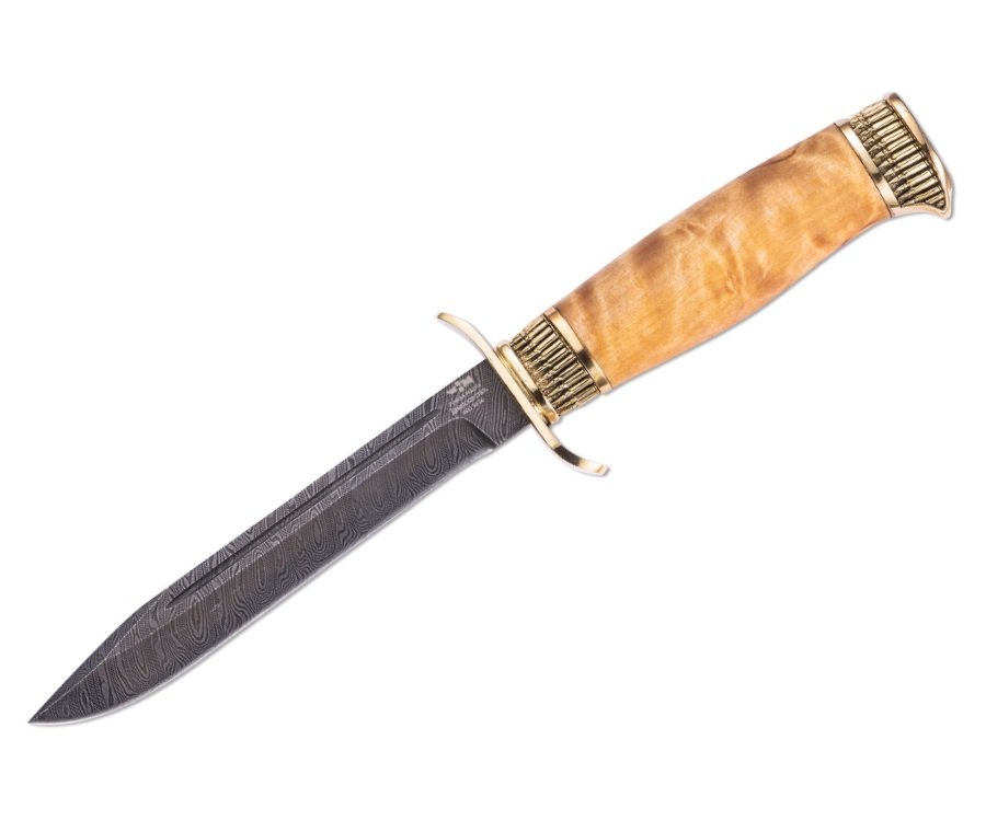 Особенность модели ― удобная и привлекательная рукоятка из карельской березы. Натуральный материал с особой пропиткой защищает изделие от воздействия влаги и растрескивания. Дополнительной балансировкой служат гарда и навершие из латуни.
