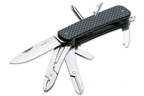 Boker 01BO824 Tech Tool Carbon 5 — многофункциональный складной нож с максимальный набором инструментов, предусмотренных в серии Tech Tool от самого старого немецкого производителя. Boker отточил собственное производство за несколько столетий существования: зародившись из небольшого семейного предприятия в 17 веке, сегодня концерн — лидер по производству ножей, отбирающий первенство у Victorinox. Его продукция более бюджетна и не уступает по качеству и функциональности швейцарским ножам.