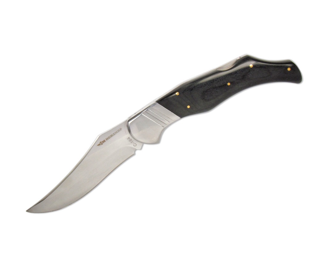 Нож складной C-164 «Ножемир» — это большой инструмент оригинальной формы, изделие известного бренда. Нож С-164 выделяется за счет клинка саблевидной конфигурации, имеющего ярко выраженный скос обуха и несколько приподнятое по отношению к обуху рукоятки острие. Основной материал ножа – легированная сталь 65Х13, за счет чего нож не подвержен коррозии. Твердость клинка – 55-56 hrc.
