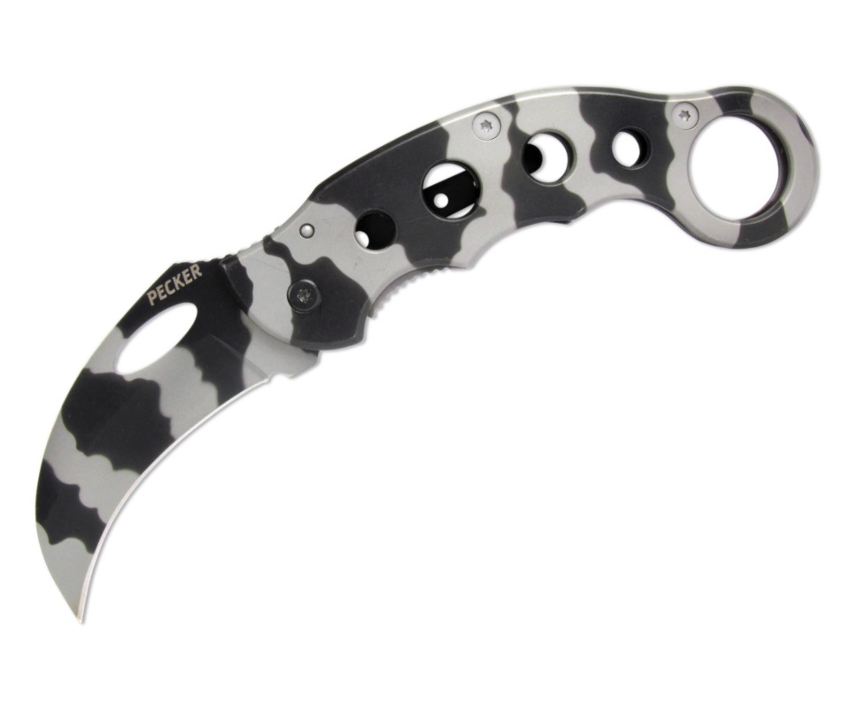 Нож складной Pecker C-178 – это оригинальный инструмент, разработанный на основе ритуальных ножей народностей Филлипинских островов. Это вариация на тему ритуально-боевого ножа керамбит, по своей форме напоминающего коготь тигра. Изделие имеет камуфляжную расцветку и серповидную форму.