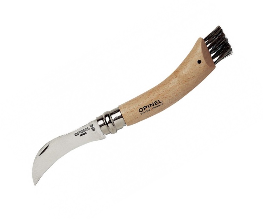 Нож Opinel для грибников №8. Изогнутый клинок. Обух клинка оснащен незаостренными зубцами: ими очень удобно удалять с гриба мох, остатки грибницы листья, грязь. Щеточка на торце рукояти очень полезна для устранения с поверхности гриба листьев, травы, земли, песка. Идеальный спутник для «тихой» охоты.