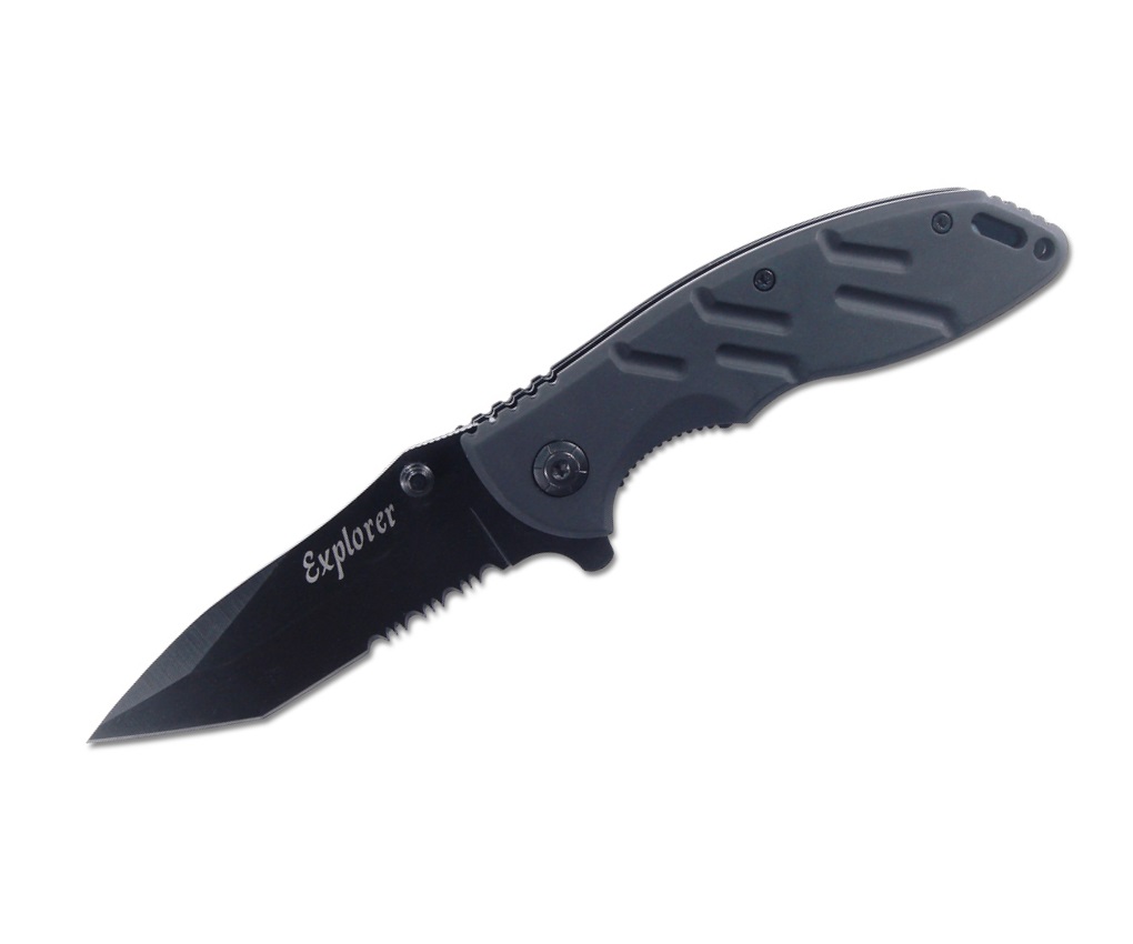 Нож выкидной 038 – это режущий инструмент автоматического типа и универсального назначения. Изделие обладает механизмом автоматического выброса клинка. Клинок укороченный, выполнен из стали 420, обух клинка имеет толщину 2,8 мм. Лезвие обладает качественной заточкой, часть лезвия имеет зубчатую заточку, что позволяет быстро и удобно разрезать волокнистые материалы – например, веревки.