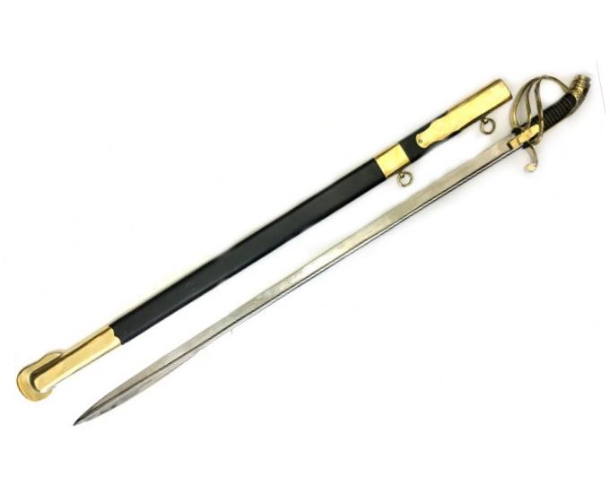 Гарда образована латунной передней дужкой, переходящей внизу в овальную чашку, с тремя боковыми дужками, с шариками, с внешней стороны. Крестовина заканчивается слегка загнутым вниз окончанием. Ножны из стали, прямой формы, овальные. Прибор ножен состоит: из плоского устья на двух винтиках, двух гаек, с подвижными кольцами и фигурного башмака.