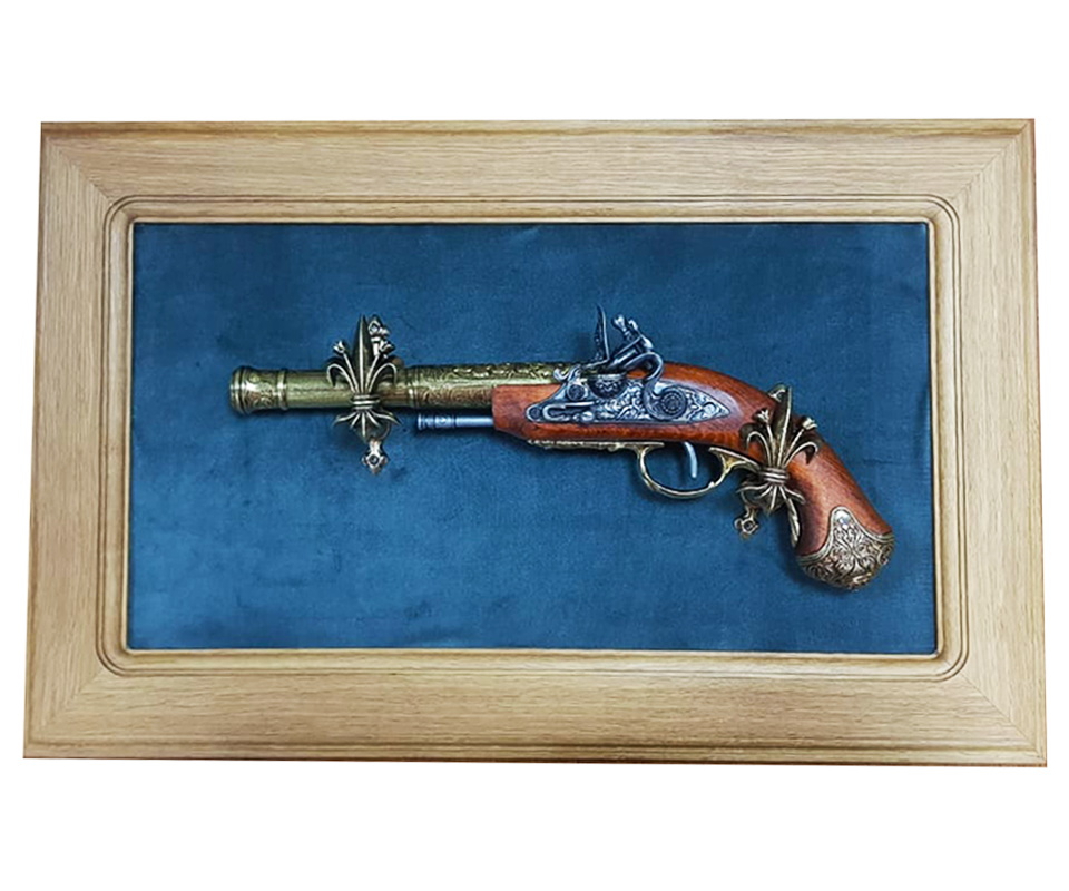 Пистолет кремневый для левшей, Индия, 18 век (DE-1296-L) на бархатном панно. Интерьерная композиция, внутренний размер 43 х 23 см, зеленый бархат, материал дуб, цвет натуральный.