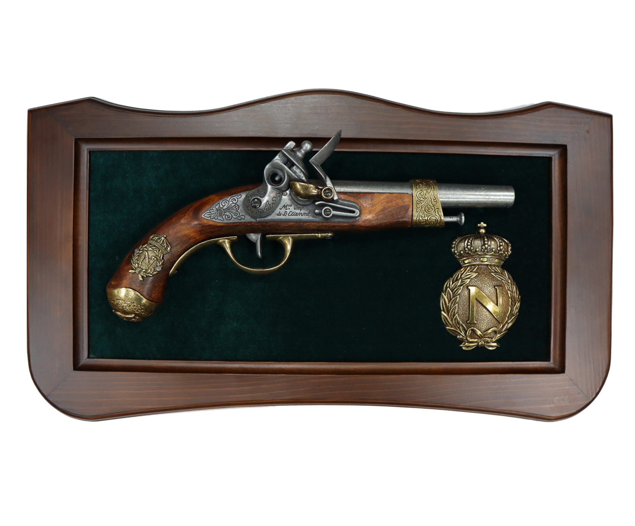 Пистолет Наполеона, изготовленный мастером Грибовалем в 1806 г., (DE-1063) на бархатном панно с вензелем Наполеона. Интерьерная композиция, зеленый бархат, цвет натуральный.