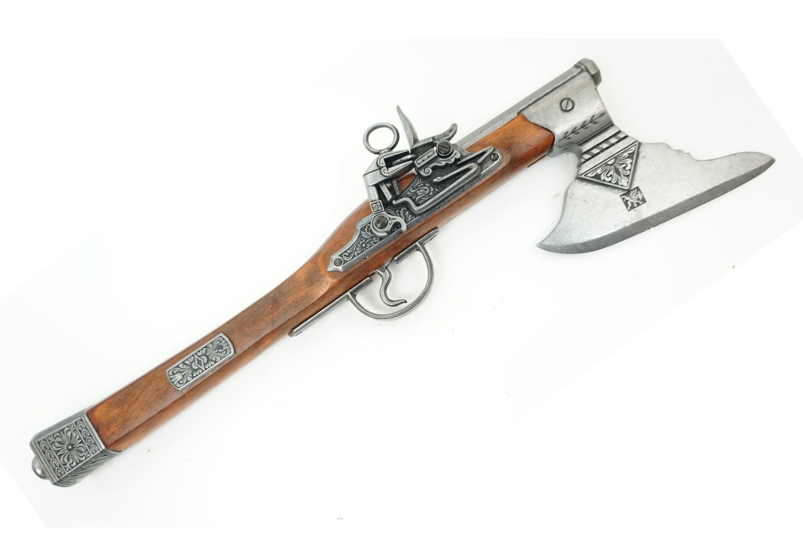 Пистолет-топор (Германия, XVII век) DE-1010 – это оригинальное изделие от испанского бренда, выполненное как точная копия германского боевого оружия 17 столетия. Изделие сочетает возможности топора и ударно-кремниевого пистолета. Пистолет-топор изготовлен в натуральную величину, и имеет очень эффектный внешний вид. Возможности такого оружия – имитация процессов взведения и спуска, без произведения выстрела какими-либо боеприпасами.