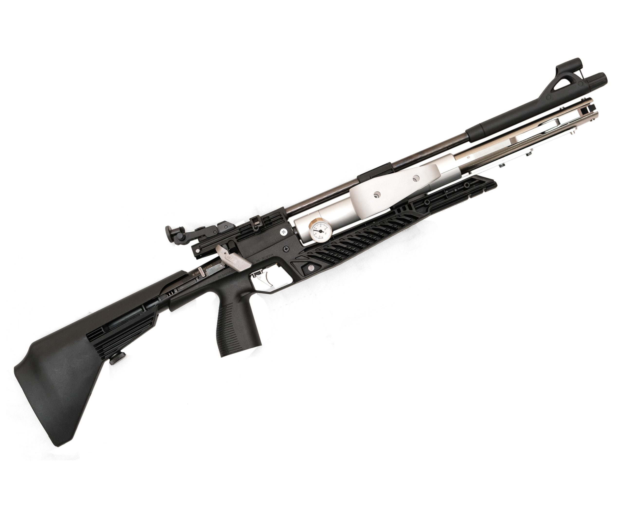 Винтовка с ручным насосом для накачки воздуха состоит из: ствола с муфтой, запирающего механизма, спускового механизма, баллона для накачки воздуха, ложи в сборе, магазинов, диоптрического прицела.