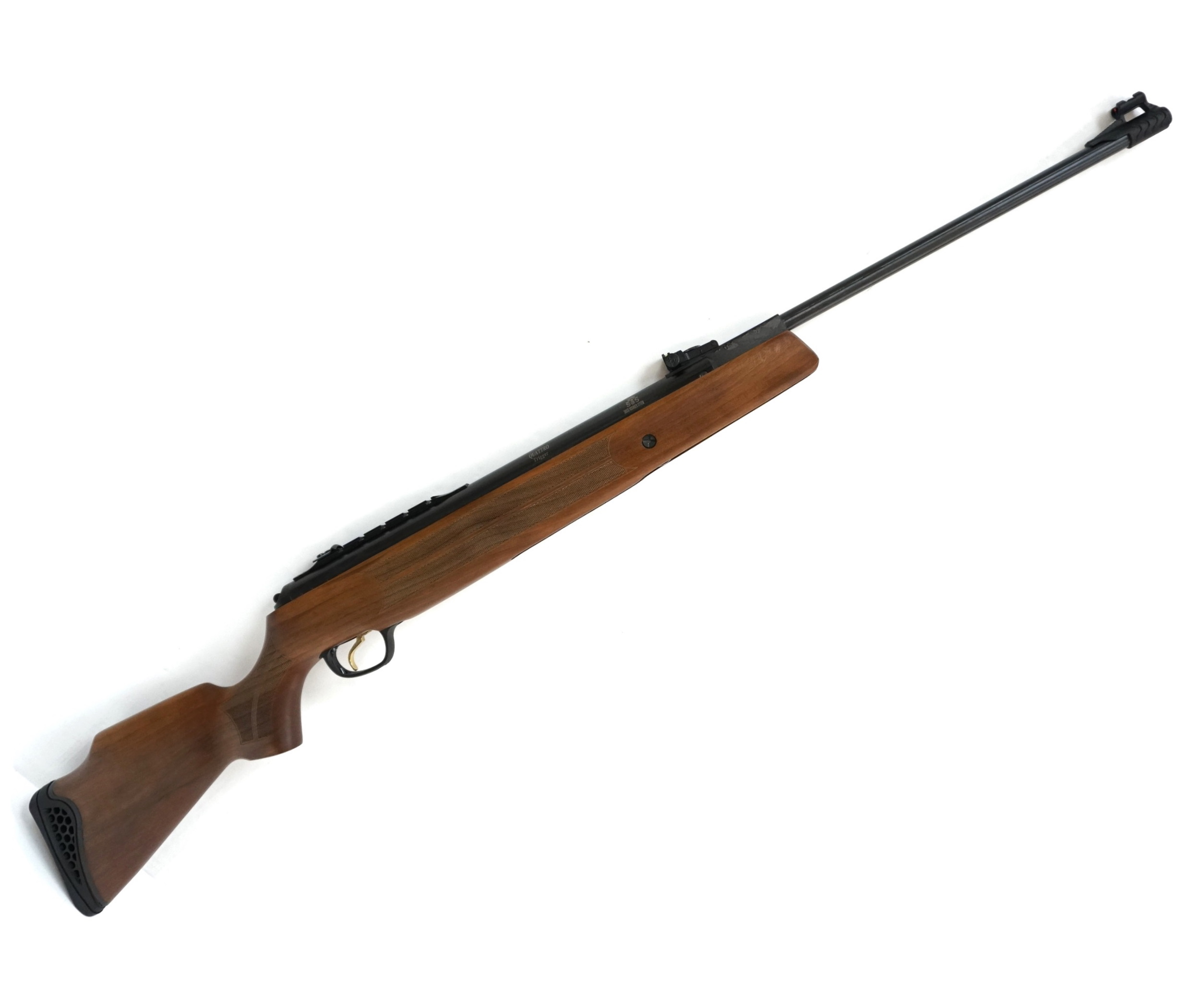 Курок этой модели имеет позолоченную основу, которая прекрасно подчеркивает стильный дизайн при этом спуск еще и довольно функционален с регулировкой силы нажатия. Двойной предохранитель, который также вошел в устройство винтовки обеспечит полную безопасность для владельца, а автоматический защитный механизм непременно поможет избежать самопроизвольного выстрела в случае выключения предохранителя при взведении пружины в боевое положение. Прицельная планка на винтовке Hatsan 135 имеет функцию микрометрической регулировки по горизонтальным и вертикальным осям, что позволяет идеально точно выполнять пристрелку ружья. Мушка открытого типа с оптоволоконным покрытием.