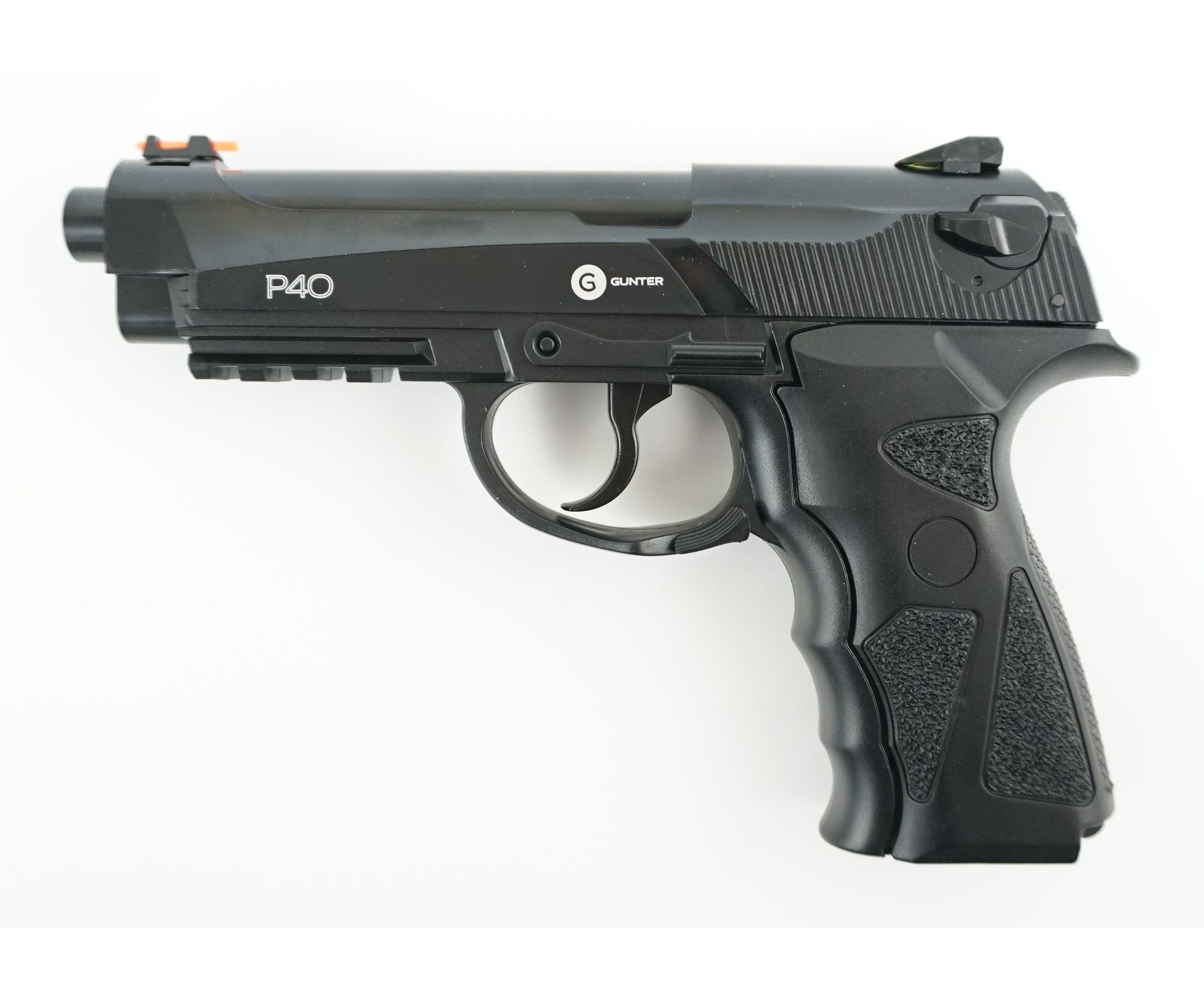 Пистолет Gunter P40 (Beretta) отличает плавность спуска, это увеличивает точность стрельбы. Прицельные приспособления в данном случае – неподвижный целик с мушкой, оснащенные цветными оптическими нитями. Это позволяет обеспечивает точность при прицеливании по затемненным мишеням. Модель отличается хорошей детализацией и неплохим качеством исполнения. Реплика соответствует оригинальному оружию как по весу 0,49 кг, так и по длине 20,8 см. Под стволом расположена планка для установки на пистолет лазерного целеуказателя или фонарика. Основа модели металлическая, корпус изготовлен из удароустойчивого пластика. Пистолет укомплектован магазином и паспортом с инструкцией по эксплуатации.