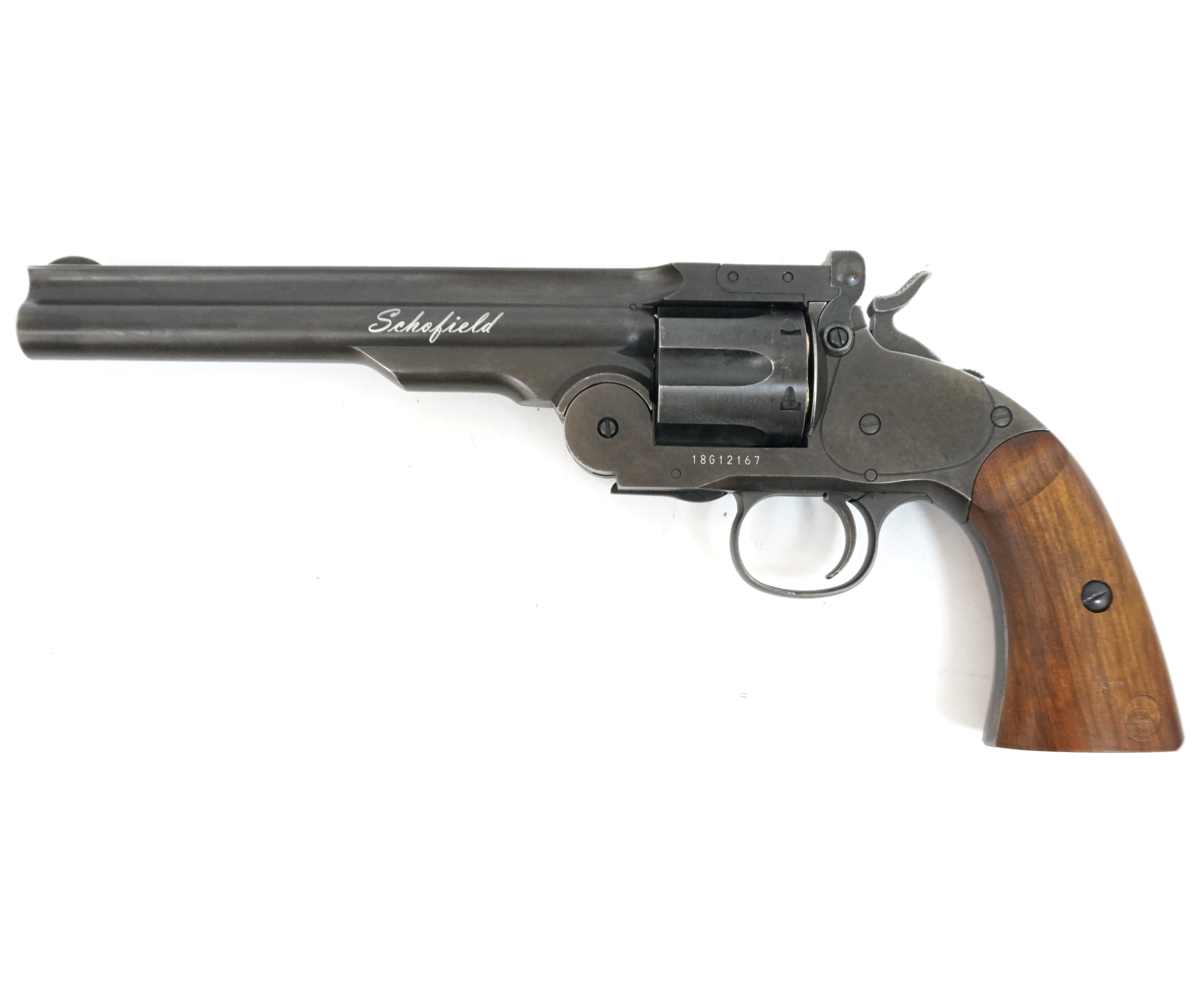 Пневматический револьвер ASG Schofield 6″ Aging Black, пулевой – это точная копия американского оружия Smith and Wesson, созданная специалистами известного датского оружейного бренда. Особенностью данного экземпляра является способ перезаряжания переламыванием ствола револьвера. Револьвер имеет барабан на 6 зарядов, боеприпасы – свинцовые пули калибра 4,5 мм, которые помещаются в картриджи-имитаторы боевых патронов. Процесс зарядки барабана аналогичен боевому экземпляру.