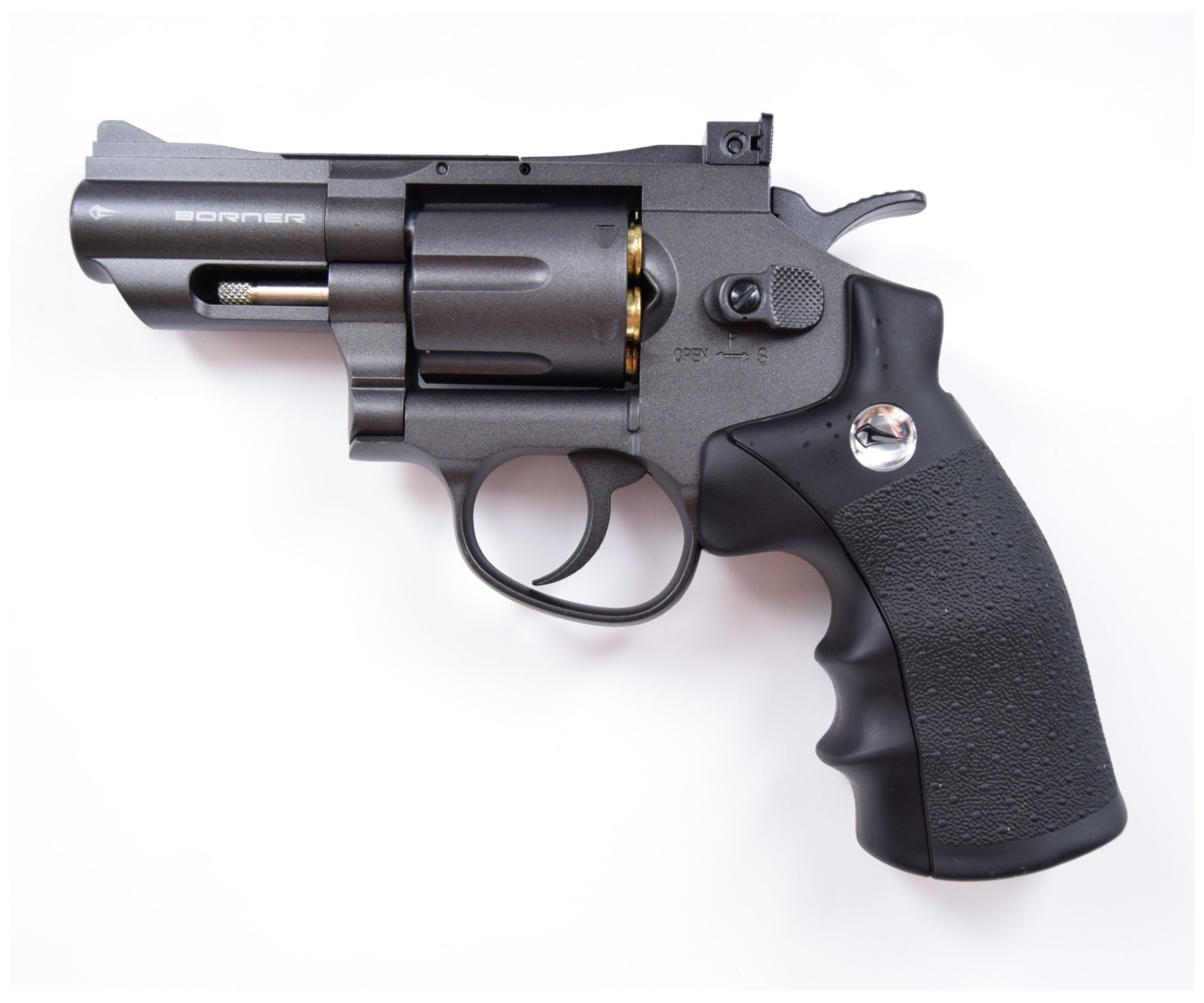 Это недорогой и довольно компактный револьвер, длина ствола которого составляет всего два дюйма. Боевой аналог Borner Super Sport 708 (2″) – легендарный Smith&Wesson. Это гладкоствольное оружие калибра 4,5 мм с барабаном на 6 патронов. Именно в фальшпатронах – главное отличие револьвера Borner Super Sport 708 (2″) от других моделей пневматических пистолетов. Стальные шары BB вставляются в патроны, имитирующие боевые.