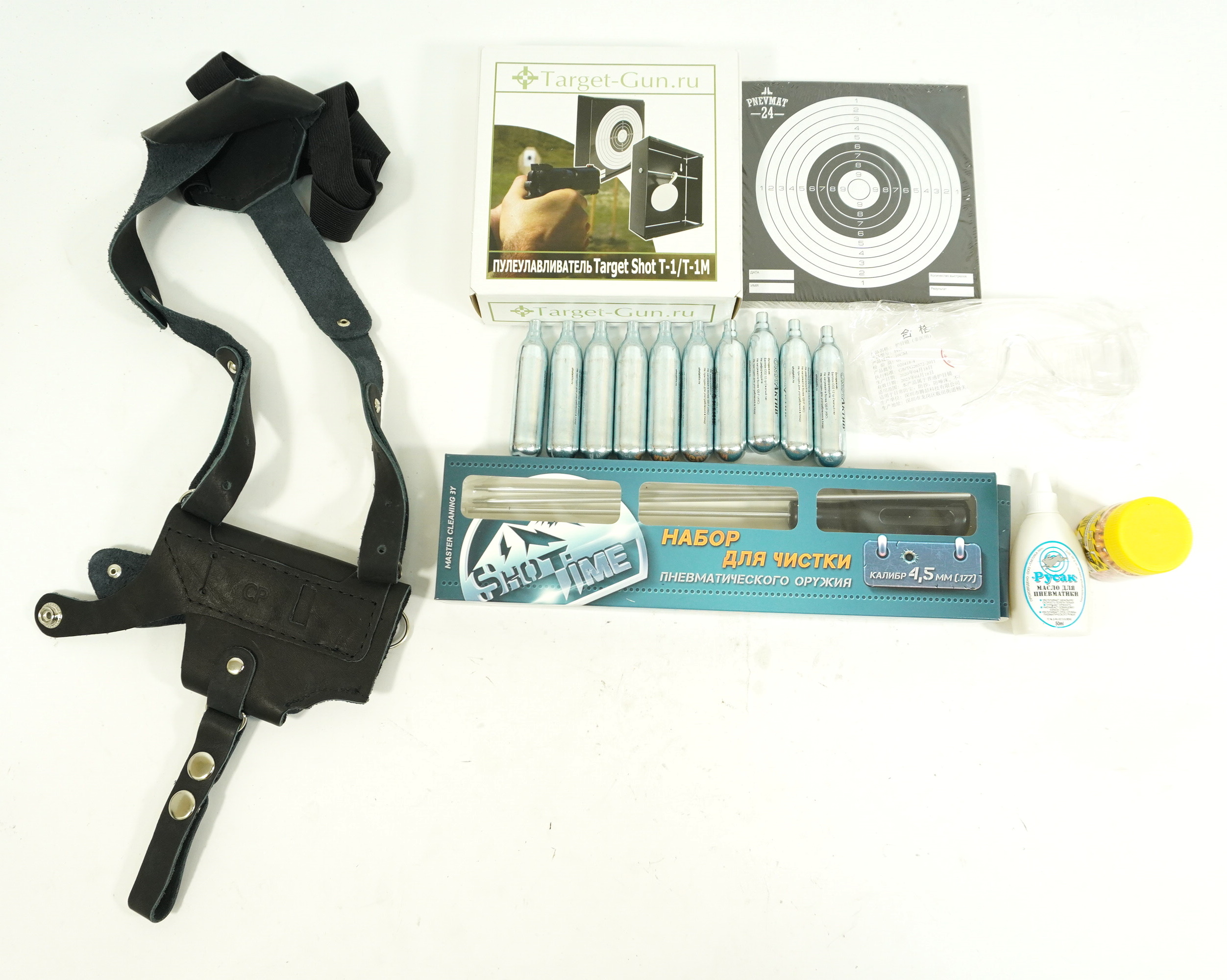 Комплект аксессуаров и расходников «Полный набор» для вашего пневматического пистолета. Универсальный набор, включает всё самое необходимое для развлекательной стрельбы и тренировок.