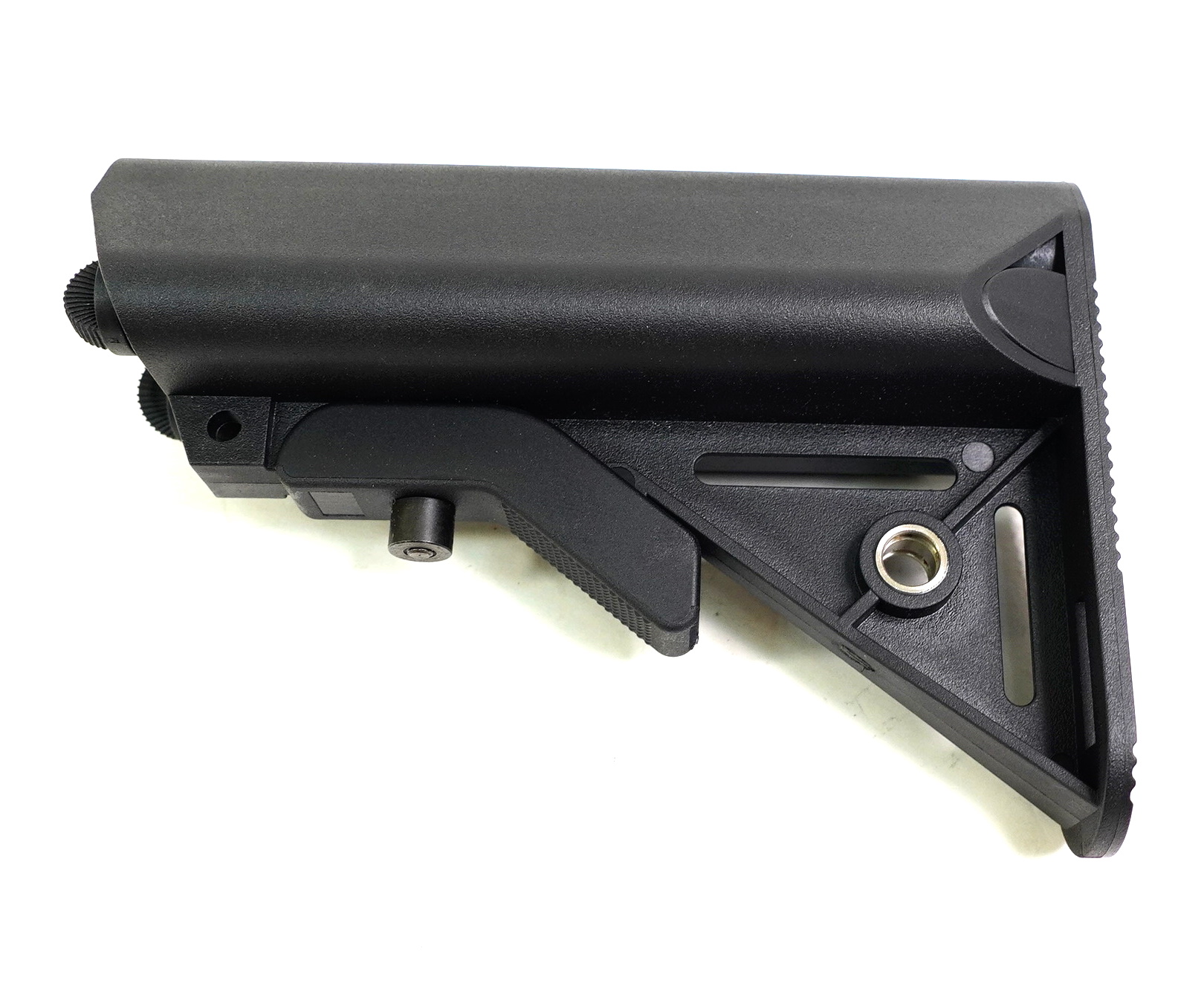 Пластиковый приклад, который предназначен для установки на стандартную трубу-направляющую таких приводов как М4, или PDW. Приклад может быть отрегулирован по длине. Тыльная часть приклада оборудована резиновой амортизирующей вставкой, закреплённой на двух винтах. Гнездо под QD Антабку.