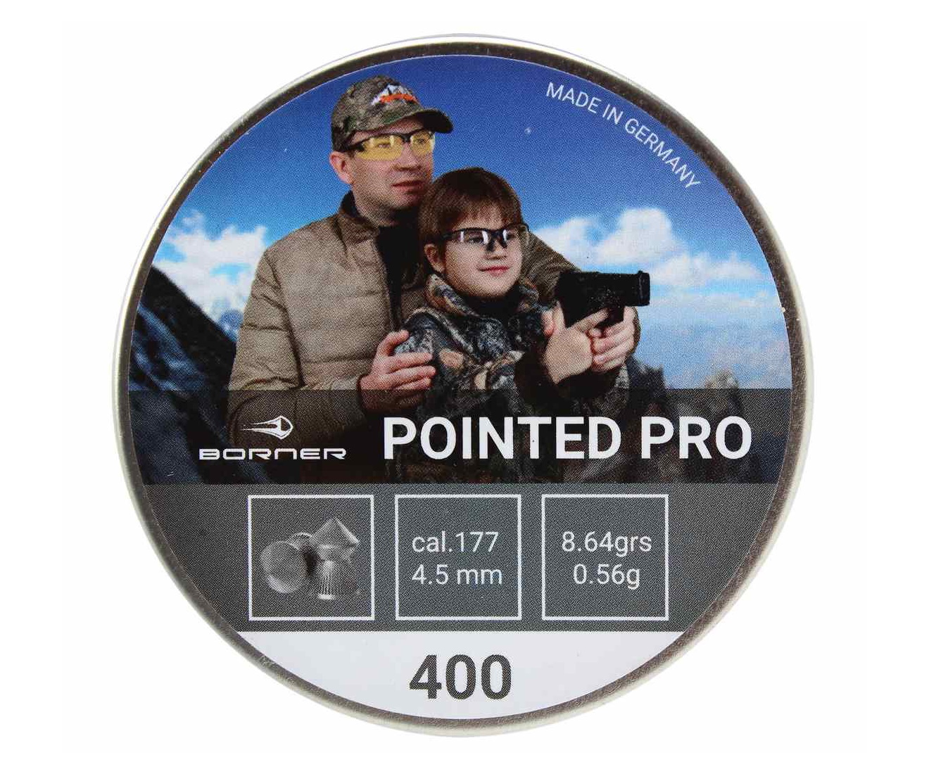 Пули Borner Pointed Pro предназначены для охоты и развлекательной стрельбы из пневматического оружия в тирах и в специально отведенных местах. Благодаря остроконечной форме, она может эффективно сохранять скорость в процессе полета. Количество пуль в банке — 400 штук средним весом 0,56 грамм.