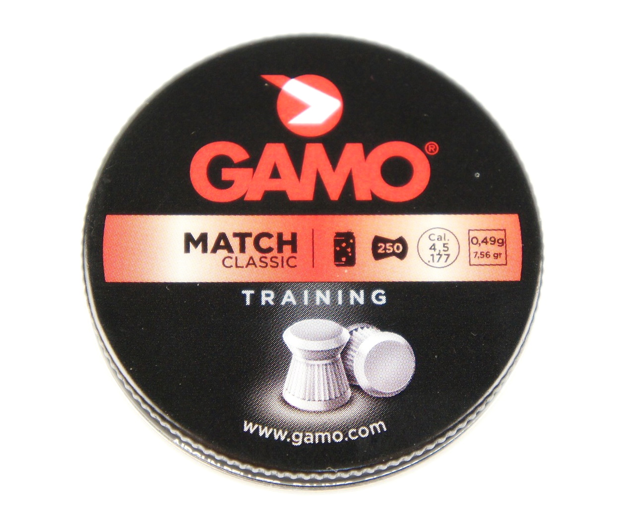 Gamo Match предназначены для развлекательной и спортивной стрельбы из нарезного пневматического оружия. Количество пуль в банке — 250 штук средним весом 0,49 грамм. Головная часть имеет плоскую поверхность, благодаря этому выбивается ровный круглый след в мишени, что значительно упрощает подсчет результатов.