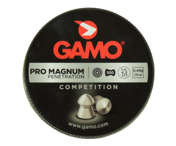 Gamo Pro Magnum 4,5 мм для пневматики предназначены для развлекательной стрельбы и в охотничьих целях. Количество пуль в банке — 500 штук средним весом 0,49 грамм. Отлично рассчитанный центр тяжести пули; головная часть имеет круглую поверхность, благодаря этому пули остаются в потоке воздуха и незначительно отклоняются от траектории и впитывают максимальную скорость.