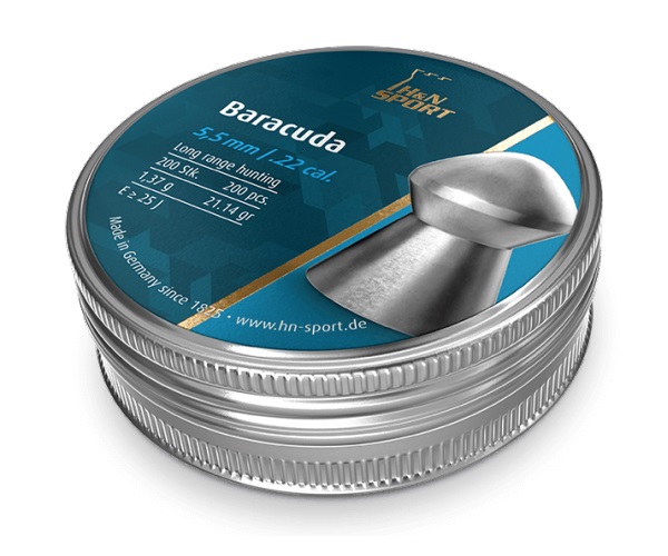 Пули H&N Baracuda для пневматики калибра 5,5 мм — тяжелые охотничьи пули с полусферической головной частью, для дальних дистанций. Первоклассный аэродинамический дизайн для высокой пробиваемости и проникающей способности. Высокая кучность. Минимальное освинцовывание и равномерное распределение попаданий благодаря специальному сплаву. Поверхность гладкая. Пули в количестве 200 штук средним весом 1,37 грамм.