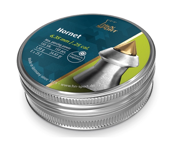 Пули H&N Hornet для пневматики калибра 6,35 мм — точные средние по тяжести охотничьи пули для средних дистанций. Высокая пробиваемость и улучшенный аэродинамический дизайн благодаря металлическому острию. Превосходная экспансивность и высокая приникающая способность. Поверхность гладкая с латунным остриём. Пули в количестве 150 штук средним весом 1,43 грамм.