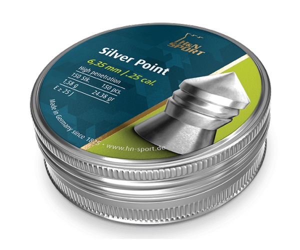 Пули H&N Silver Point для пневматики калибра 6,35 мм — тяжелые точные пули с конической головной частью, для средних дистанций. Высокая пробиваемость и проникающая способность с наивысшим шоковым воздействием. Поверхность гладкая, с канавками. Пули в количестве 150 штук средним весом 1,58 грамм.