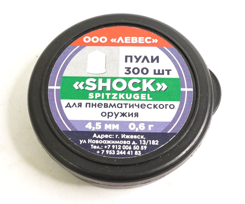 Пули Левес Shock spitzkugel калибра 4,5 мм — средние по тяжести, остроконечные пули для охоты и прецизионной стрельбы для средних дистанций. Аэродинамический дизайн для настильной траектории полета и высокой пробиваемости. В упаковке 300 штук, средний вес 0,60 грамм.