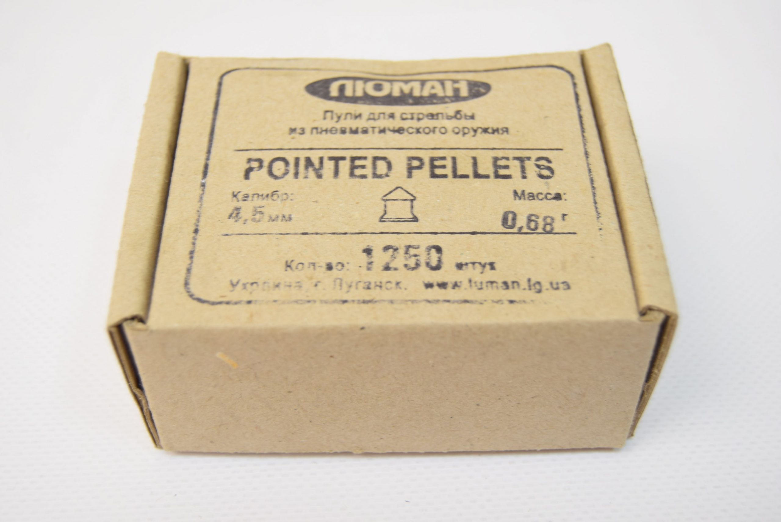 Пули Люман Pointed Pellets 0,68 г — тяжелые остроголовые свинцовые пули с гладкой поверхностью. Высокая кучность и пробиваемость. Предназначены для развлекательной стрельбы из пневматического оружия на дистанциях до 25 метров. Калибр — 4,5 мм. Упаковка — картонная коробка 1250 шт.