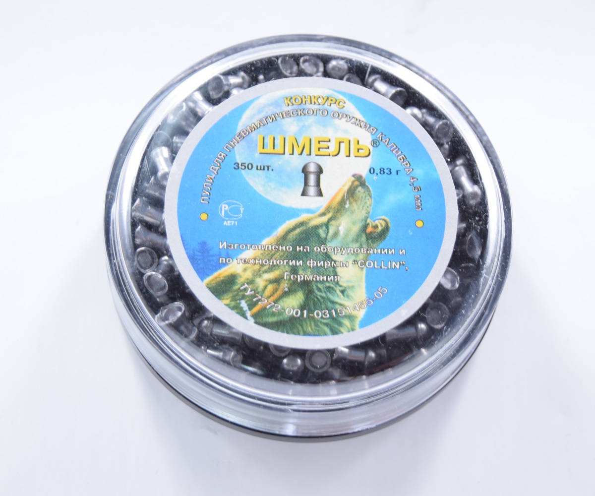 Пули Шмель «Конкурс» калибра 4,5 мм — штампованные свинцовые пули с полусферической головной частью. Тяжелые свинцовые пули для охоты из мощной пневматики. Обладают отличными баллистическими характеристиками. В упаковке 350 штук, средний вес 0,83 грамм.