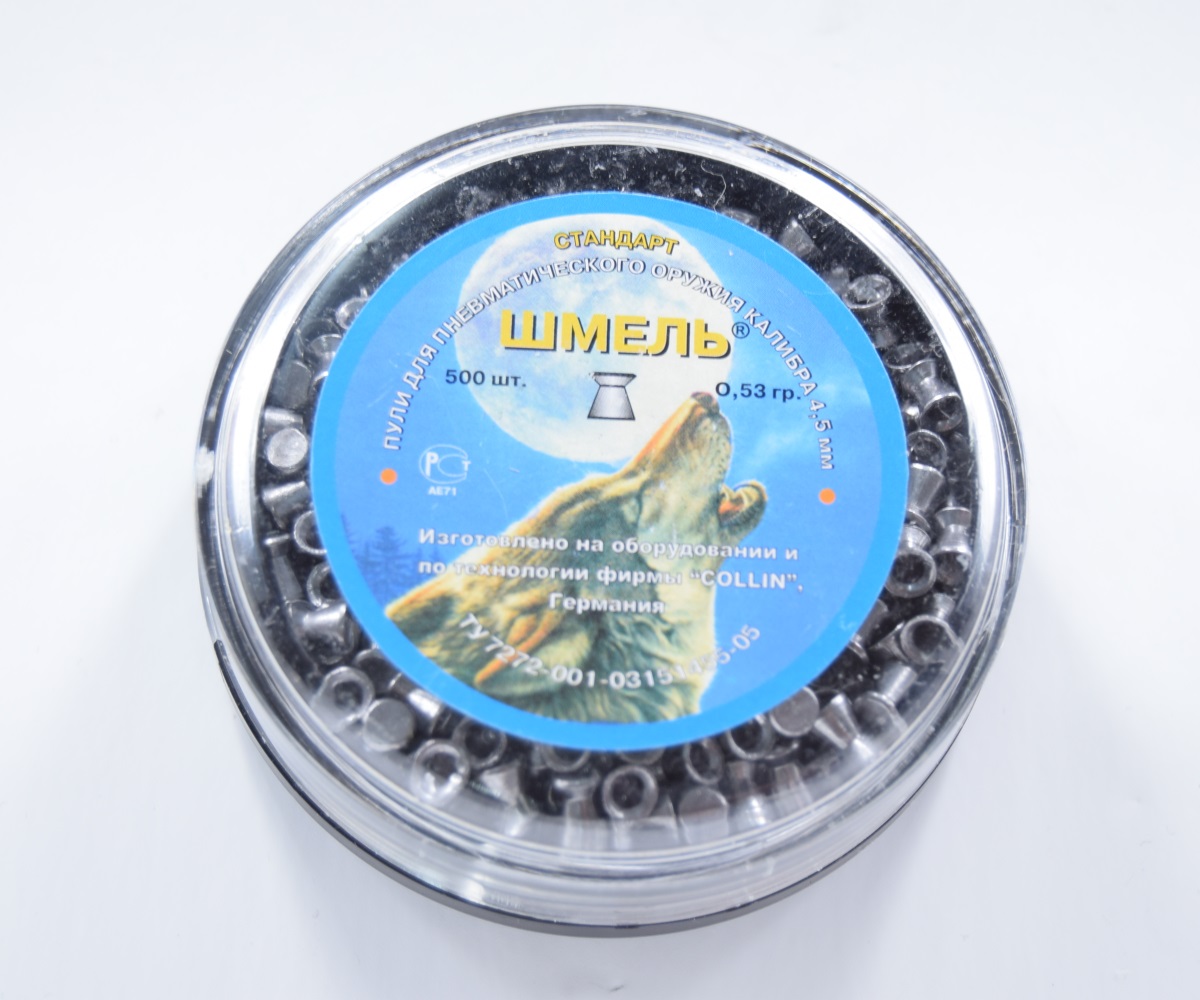 Пули Шмель стандарт калибра 4,5 мм — штампованные свинцовые пули с плоской головной частью. Благодаря превосходным баллистическим характеристикам, обеспечивает достойную кучность, стабильность и четкие края пробоин при стрельбе из любого пневматического оружия. Подходит спортсменам-стрелкам. В упаковке 500 штук, средний вес 0,53 грамм.