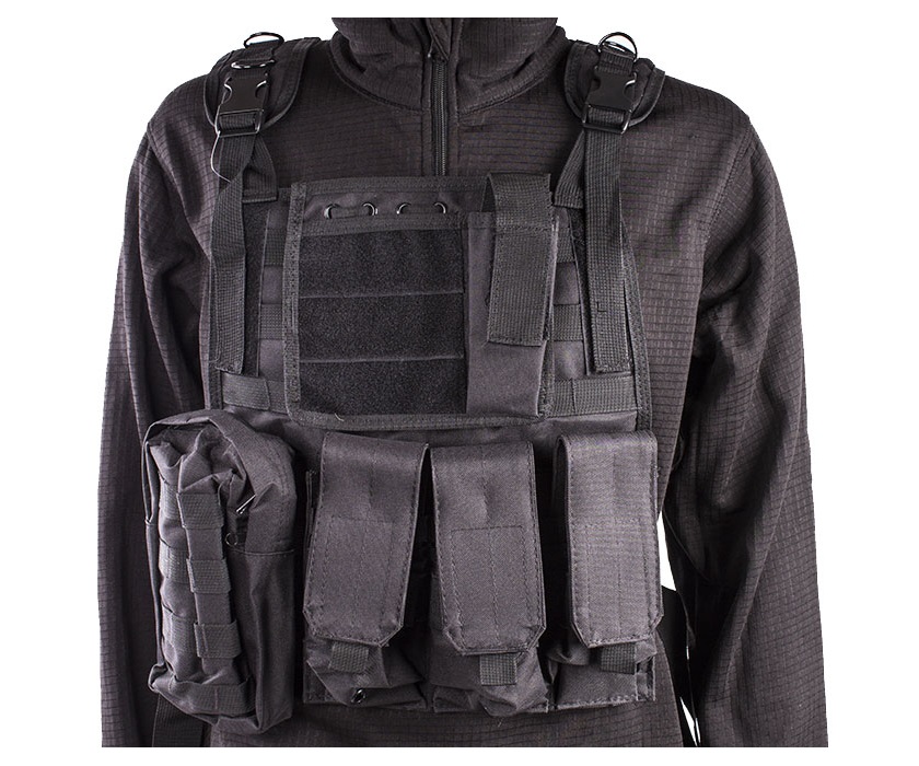 Разгрузочный жилет MOLLE Black выполнен в виде элемента снаряжения с 5-ю подсумками на груди, что обеспечивает комфортное ношение аптечки, медицинского пакета, оружия, а также гранат и фляги. Основное предназначение для силового типа подразделений, проведения игр в страйкбол, охотников и для лиц, которые предпочитают активный жизненный образ.