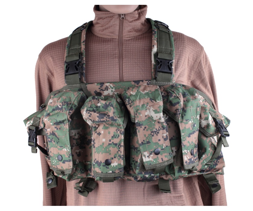 Во вместительный нагрудный разгрузочный жилет VT017WD входит помимо сопутствующего снаряжения 8 магазинов АК-серии. Для этого на передней панели размещены 4 оружейных карманов, вмещающих по 2 магазина каждый, а также 2 утилитарных подсумка. Карман, в котором должны размещаться документы, находится на внутренней стороне панели.