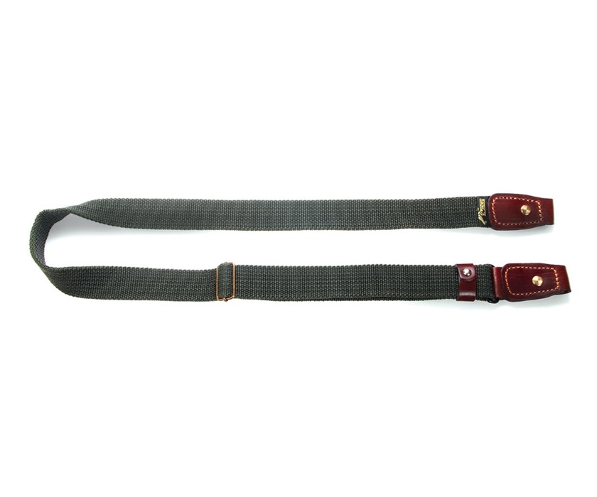 Ремень для ружья предназначен для съемных антабок. Выполнен ремень из полиамидной ленты. Крепления изготовлены из натуральной кожи. Рабочая сторона ремня обладает противоскользящими свойствами. Длина ремня для ружья регулируется.