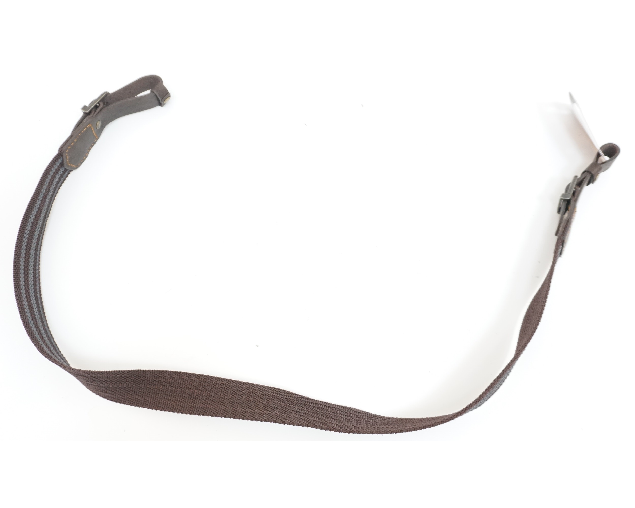 Ремень из полиамидной ленты коричневый, шириной 35 мм, толщиной 3,5 мм, рабочая сторона ремня обладает противоскользящими свойствами. Длина ремня регулируется пряжками от 90 см до 100 см. Антабки отсутствуют. Ширина ремешков крепления на антабку 20 мм, толщина 2 мм. Детали, крепящиеся к пряжкам, из натуральной кожи. Конструкция скреплена заклепками.