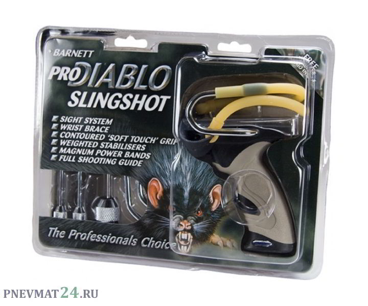 Рогатка Pro Diablo от фирмы Barnett. Рогатка профессионального класса, значительно выше чем у других рогаток. Обширно работающая на соревнованиях и на охоте, имеет стабилизаторы, которые способствуют более точному выстрелу, абсолютно исключая «доброс» снаряда движением опорной руки. Оборудована упором на предплечье и настраиваемым прицельным механизмом.