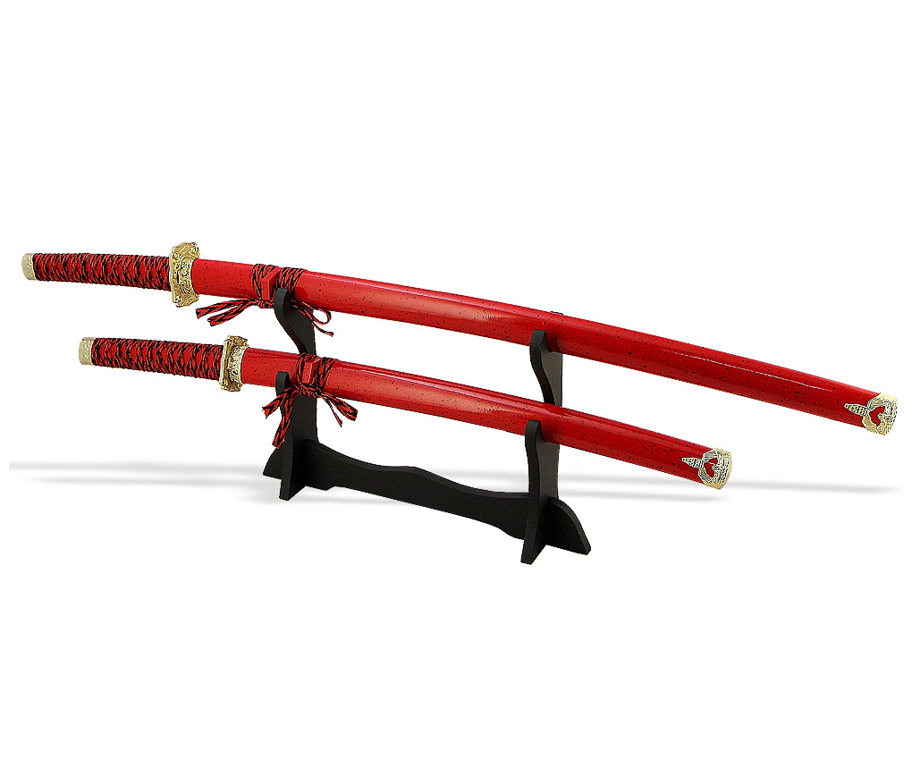 Роскошный набор самурайских мечей с яркими ножнами цвета алый мрамор и цубой окрашенной под золото. Состоит из одного меча Катана и одного меча Вакидзаси. Великолепный подарок поклонникам японской культуры. Также подходит для оформления стиля и дизайна в японском стиле. Настольная подставка в комплекте.