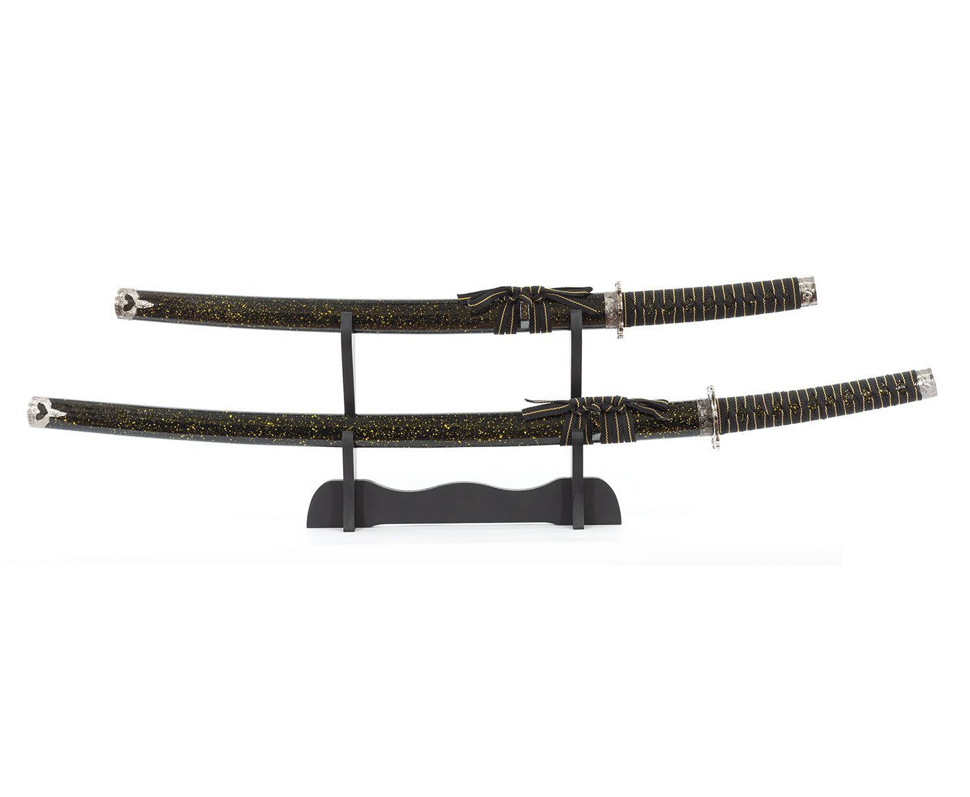 Неординарный набор японских мечей с исключительными ножнами цвета черный мрамор, рукоять прошита желтыми нитками. Состоит из одного меча Катана и одного меча Вакидзаси. Настольная подставка в комплекте.