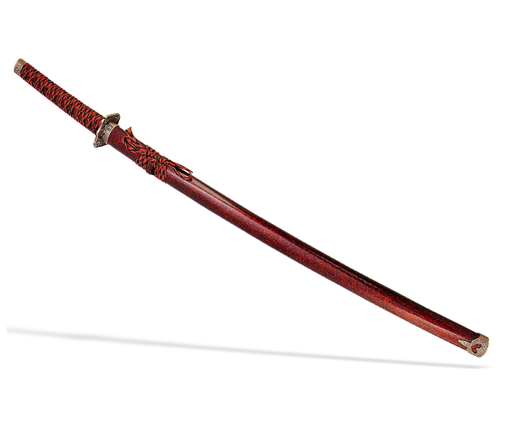 Яркая и эффектная японская Катана с великолепными ножнами в цвете бордовый мрамор и рукоятью черно-красного цвета. Бесподобный подарок поклонникам японской культуры и интерьера в японском стиле. Настольная подставка в комплекте.