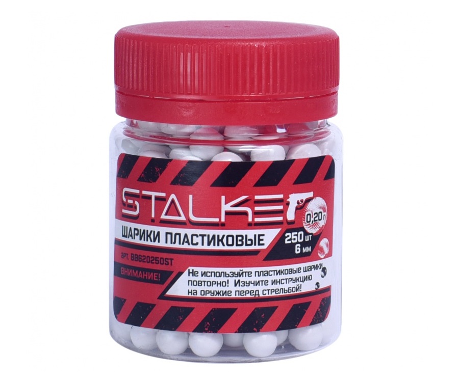 Шарики пластиковые для страйкбола Stalker 6 мм, белые — высокоточные шары улучшенной геометрии калибра 6 мм весом 0,20 грамм для игры в страйкбол. Поставляются в баночке количеством 250 штук.