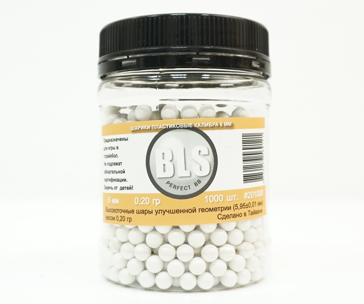 Пластиковые шарики калибром 6 мм BLS весом 0,20 грамм предназначены для стрельбы из страйкбольных пистолетов и винтовок. Количество в баночке — 1000 штук. Диаметр 5,95 мм, погрешность в диаметре этих шариков составляет всего 0,01 мм.