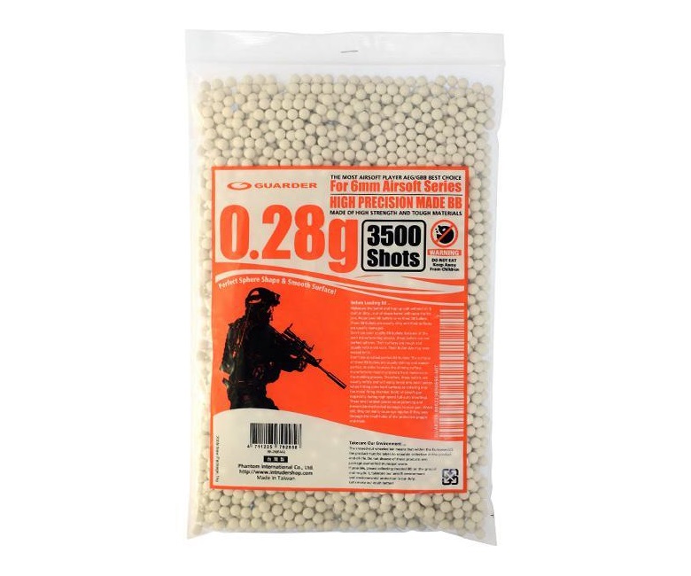 Шары Guarder BBs калибра 6 мм, белого цвета, с массой 0,28 грамм отлично подходят для стрельбы из страйкбольных пистолетов и приводов. В упаковке примерно 3500 штук.