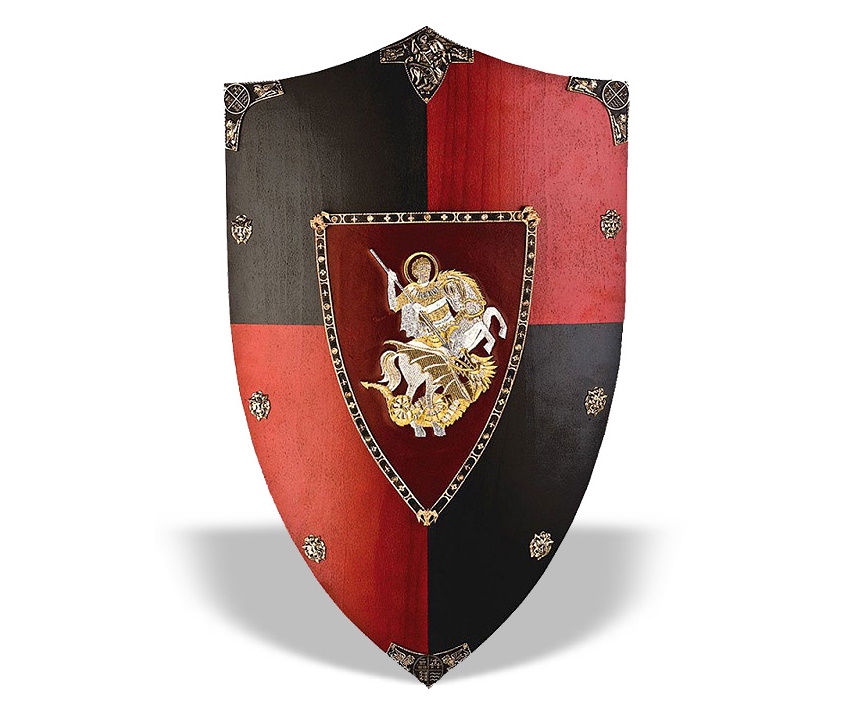 Деревянный геральдический щит «Георгий Победоносец». Этот популярный щит — предмет искусства испанских мастеров Art Gladius из Испании, выполнен и окрашен в ручную в насыщенном черном и кроваво-красном цветах с красивыми золотыми деталями. Золотая и серебряная центральная часть украшена вышивкой на бордовой коже, на которой изображен Святой Георгий поражающий дракона (Saint George slaying the Dragon).