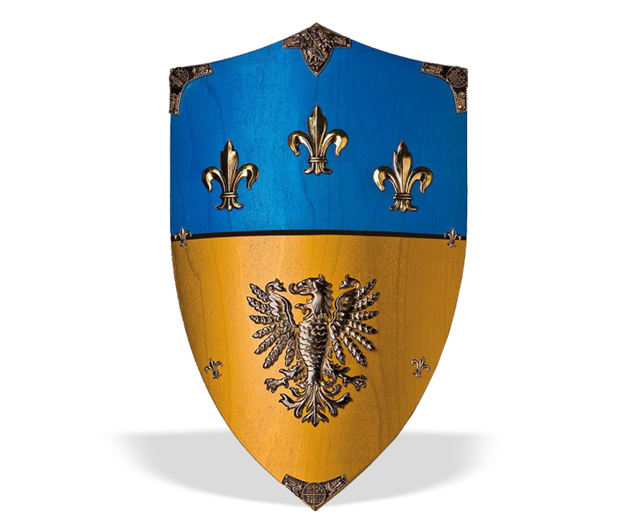 Деревянный щит Карла Великого геральдический (Charlemagne wooden shield). Сделанный из прочного дерева, ярко окрашенного синим и золотым цветом, украшен золотым Fleur De Lis с геральдическим гребнем, этот эффектный щит назван в честь великого Карла Великого, короля воинов, который занимает своё место среди «Девяти достоиных» (Девять исторических фигур, которые считаются живым воплощением героического рыцарства) наряду с такими известными личностями, как Юлий Цезарь, Александр Македонский и Король Артур.