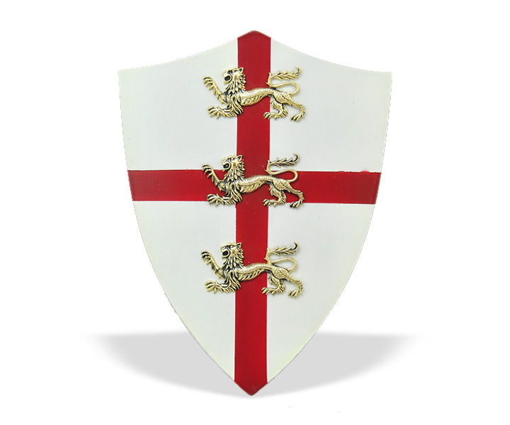 Деревянный геральдический мини-щит Ричарда «Львиное сердце» (Richard Lion Heart Shield). Средневековый щит Ричарда Львиное Сердце миниатюрный, белый фон, в центре Красный Крест, украшенный 3 львами на вертикальной линии. Оснащен кронштейном на обратной стороне для крепления на стену или на клинок меча.