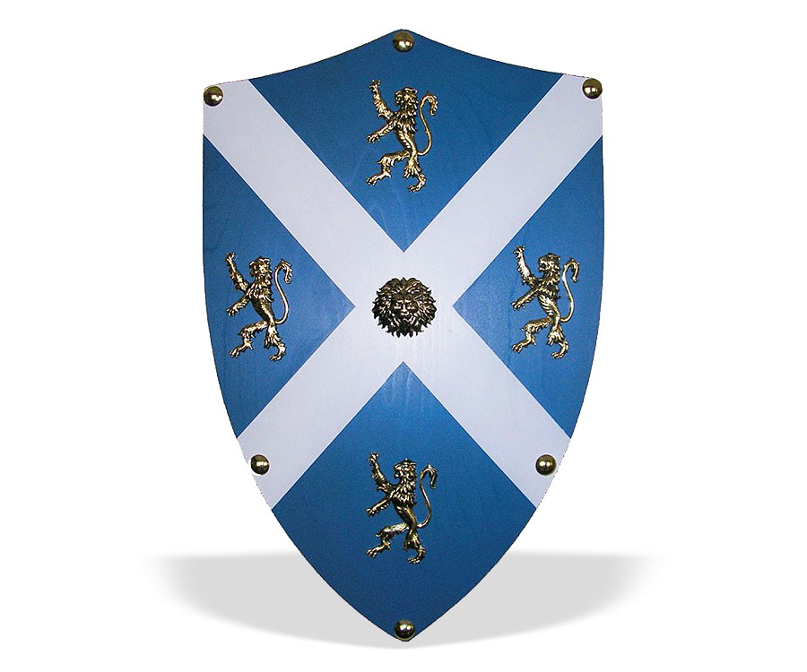 Щит Святого Андрея выполнен из дерева и окрашен крестом Святого Андрея. Он украшен латунными львами и латунной декоративной фурнитурой. На обратной стороне щита висячая цепь и устройство для вертикального крепления одного меча или 2 скрещенных мечей.