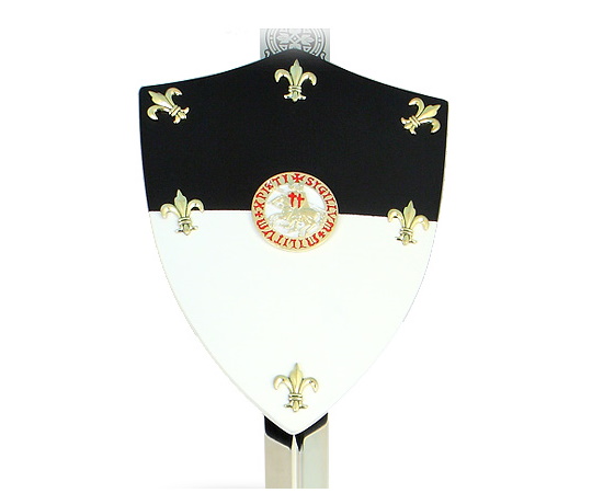 Рыцарь Тамплиеров на коне в центре щита. Украшен цветком лилии в контуре. Оснащен кронштейном на обратной стороне для крепления на стену или на клинок меча. Ручная работа. Отлично подходит для украшения оружейных комнат и декора в рыцарском стиле.