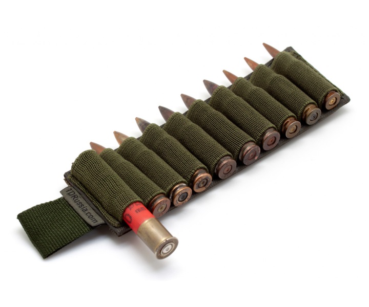 Патронташ Долг для хранения и транспортировки 10 нарезных патронов, цвета хаки. Плотная резинка, шириной 40 мм пришита с определенным шагом для фиксации патронов разного калибра.