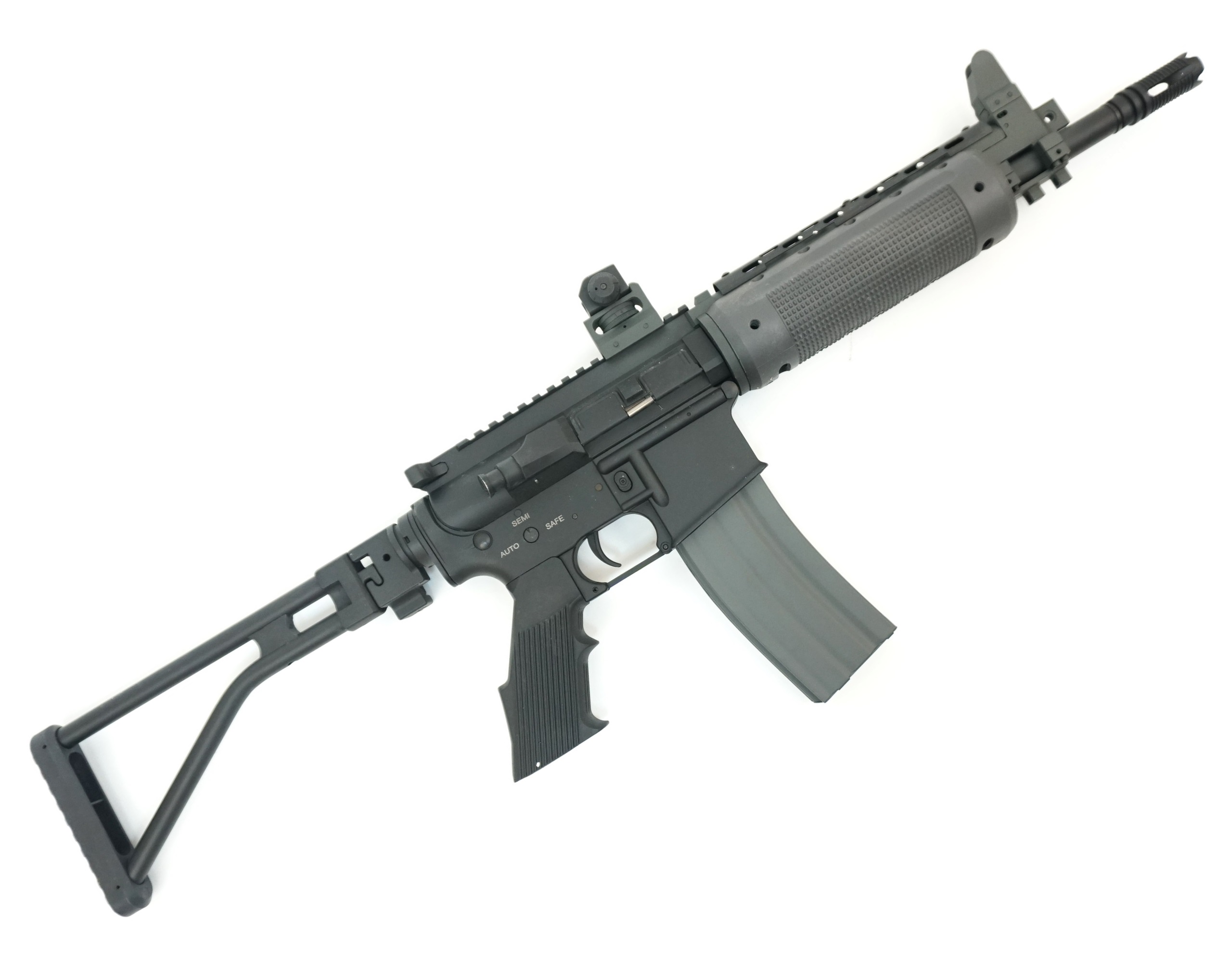 Штатные прицельные приспособления карабина – это мушка и диоптр съемного типа на верхней планке. Корпус у этого привода алюминиевый, приклад выполнен из металла, он складывается вправо и дополнительно оснащен внизу антабкой для ремня. Рукоять пистолетного типа и цевье выполнены из пластика ABS. Замена магазина будет удобна и правшам, и левшам, так как кнопка его выброса установлена на правой стороне нижнего ресивера.