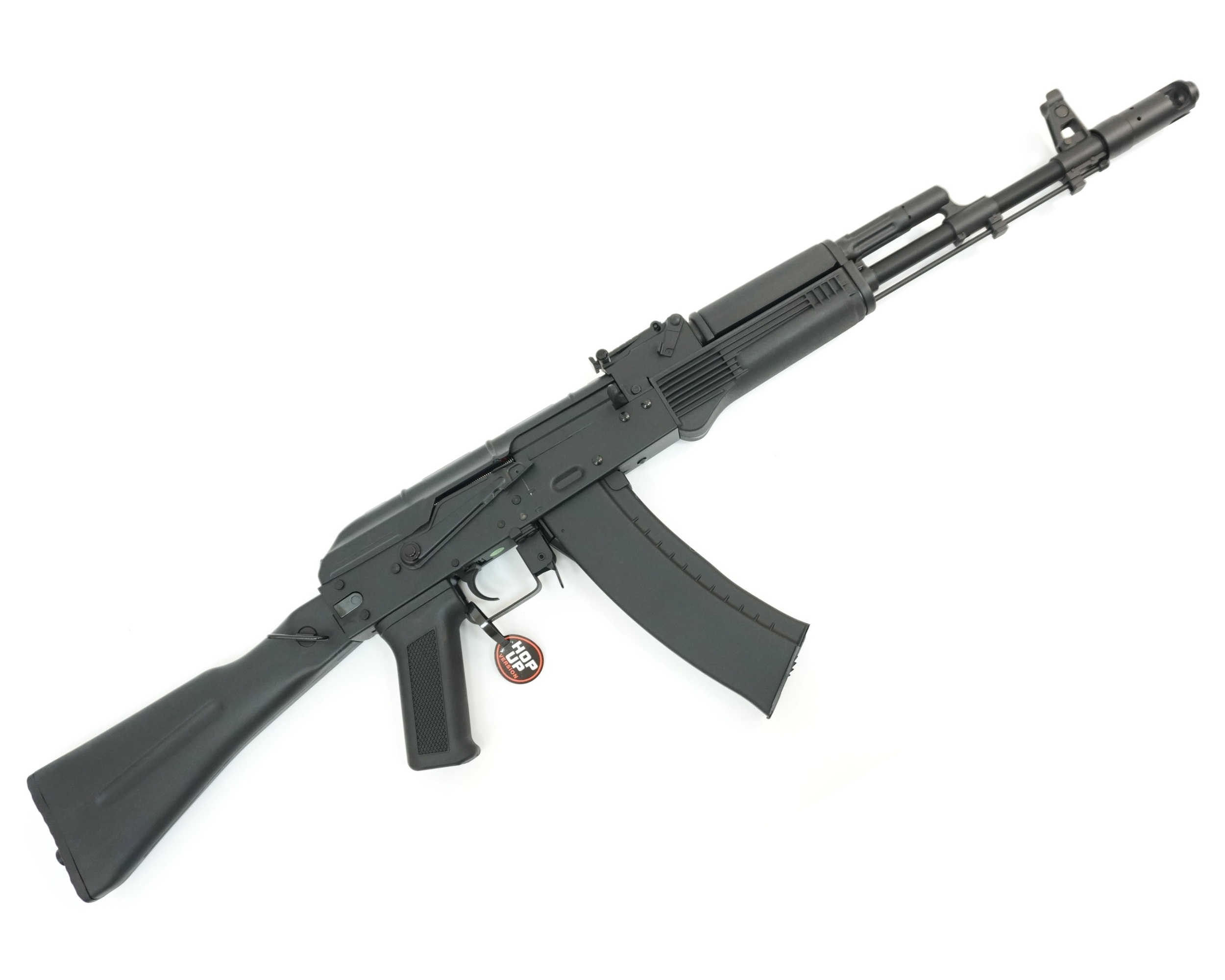 Страйкбольный автомат Cyma АК-74М (CM040C) – электропневматическая модификация отечественного автомата, выполненная специалистами популярного бренда пневматики. Привод отличает металлический корпус и высокое качество сборки. Стреляет автомат шариками из пластика весом 0,2 г. Здесь используется металлический гирбокс производства этого бренда и регулируемая камера Hop-up, подкручивающая шарики в полете.