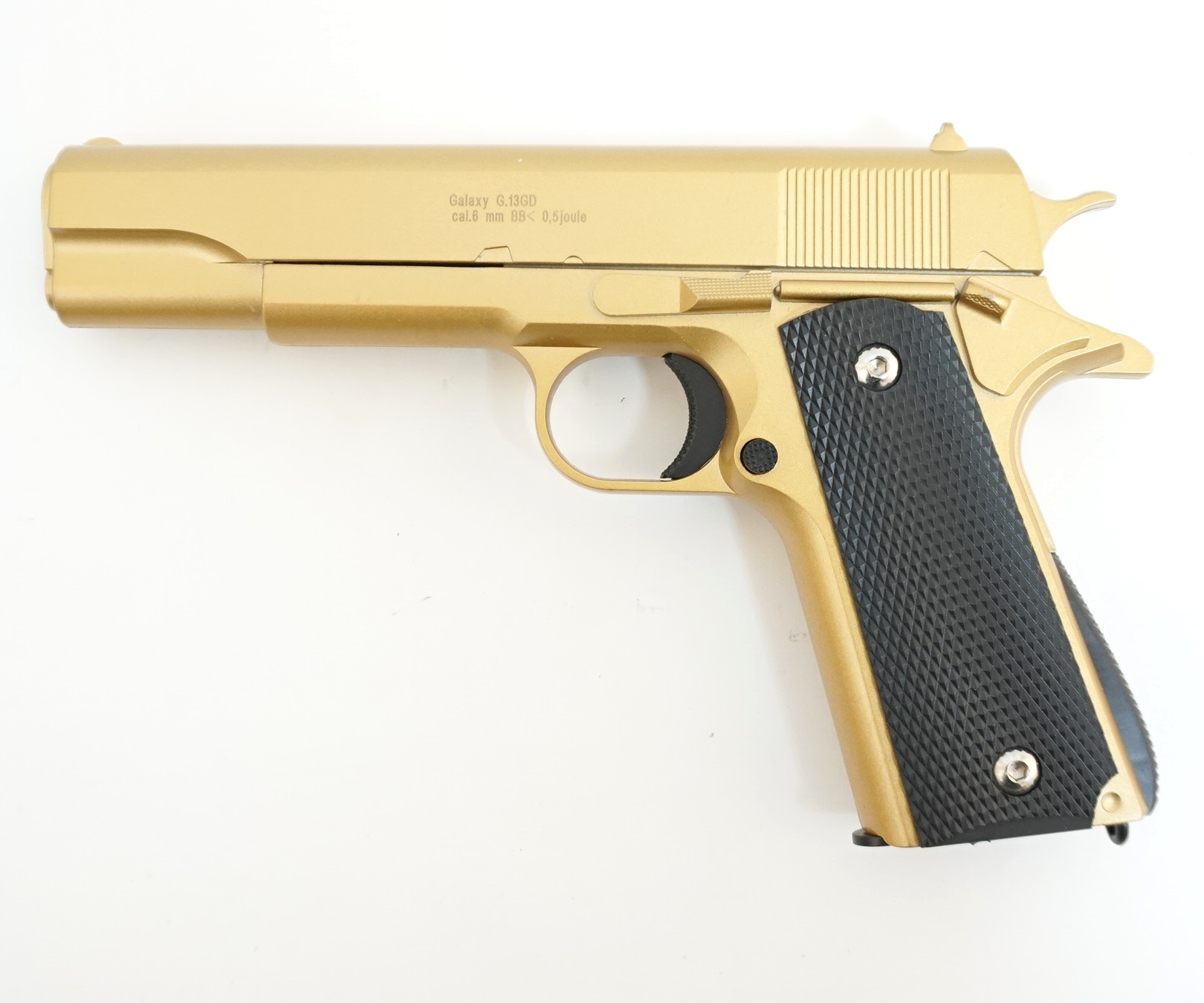 Galaxy G.13GD — качественная спринговая страйкбольная модель классического пистолета Colt 1911, изготовленная из качественного цинкового сплава и пластика. Цвет золотой. Начальная скорость выстрела шарика 70-79 метров в секунду.