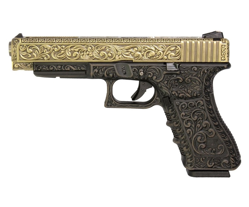 Описание страйкбольного пистолета WE Glock-34 gen3, под бронзу с гравировкой: