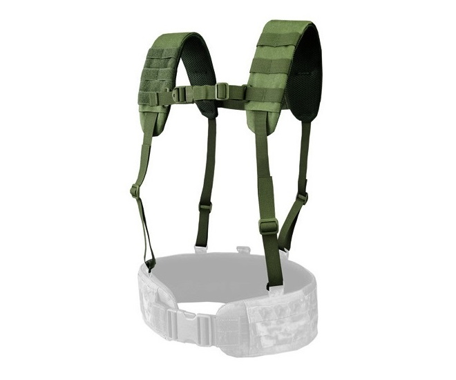 - Плечи усилены пенкой и имеют стропы MOLLE, что позволяет использовать пояс с суспендерами как полноценную РПС;